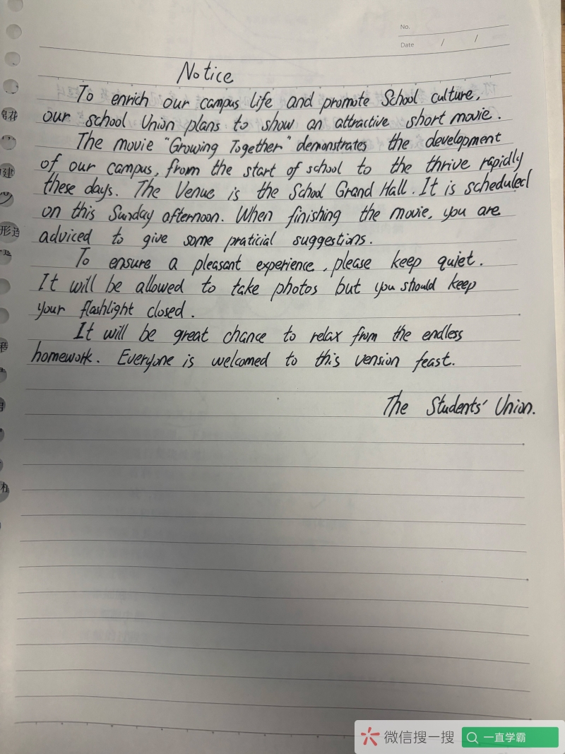 高中英语语文作文半年 你受学生会委托为校宣传栏英语天地写一则通知,请大家观看一部英文短片GrowingTogether内容,包括1短片内容学校的发展,二放映地点时间三,欢迎大家对短篇提出建议和意见 ㅤㅤㅤㅤ 2025-11-16 1 评论 0 喜欢