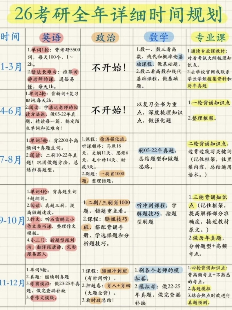 考研上岸搭子 🔥26考研人必看保姆级规划(实战上岸篇)26考研的宝子们,考研这场马拉松已经在向你招手啦,科学规划是上岸的关键,今天就来给大家安排上全年超详细时间规划,全程干货无废话,直接码住开冲!💨📅现在-2024年12月:信息收集与准备🎯院校专业:去研招网、目标院校官网查招生目录、历年分数线、报录比。在学霸君、知乎搜上岸经验,找2-3个备选院校,方便后续根据复习情况调整。📚资料准备:英语词汇书(《红宝书》《恋练有词》)、真题(《考研真相》《黄皮书》);专业课参考书目(目标院校指定的)。📅2025年1月-2025年6月:打牢基础📖英语:每天早上30-60分钟背单词,用APP辅助加深记忆。下午花1-2小时学语法,分析长难句,每周做3-4篇阅读真题,只做阅读,分析错题原因。🧮数学:跟着基础课视频(汤家凤、武忠祥),按高数、线代、概率论顺序学,学完一章做一章习题(《660题》《汤家凤1800题》基础篇),整理错题。📚专业课:通读参考书目,梳理框架,整理笔记,每本书列好章节大纲,方便后续背诵。📅2025年7月-2025年10月:强化提升📖英语:单词每天1-2小时,背真题里的生词。下午做阅读真题(05-18年),总结技巧,学翻译、新题型,每周写1-2篇作文(小作文书信、大作文图表或图画)。🧮数学:强化课(张宇、李永乐强化班)搭配刷题(《李林880题》《张宇1000题》强化篇),整理错题,总结解题方法,定期模拟考试(近10年真题)。📚专业课:背诵重点知识点,做真题,分析命题规律,整理答题思路,拓展专业知识,关注行业热点。📅2025年11月-2025年12月:冲刺决胜📖英语:全真模拟考试(19-24年真题),每周2-3次,背诵作文模板,积累好词好句。🧮数学:全真模拟(李林6套卷、4套卷,合工大超越共创),限时答题,回归错题和基础知识点。📚专业课:反复背诵知识点,模拟考试,注意答题规范和时间分配,查漏补缺。考研是一场自我挑战,稳住心态,坚持到底,你就是研究生!有问题评论区见,大家一起加油!💪#考研规划#考研备考攻略#考研经验分享#考研上岸经验#考研时间安排#26考研#考研英语#考研数学 的非师范的 🤖 2025-06-09 0 评论 0 喜欢