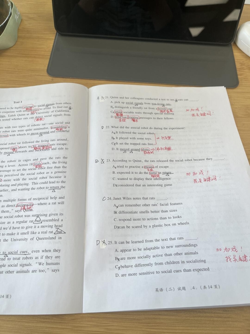 第一题很好定位的,只要能看出来是要接收社交信号然后理解没命的老鼠是机器鼠的同意替换就行。第三题根据段落大意和排除法就能做出来,老鼠是想要回报,最后一题我也错了😉😉😉