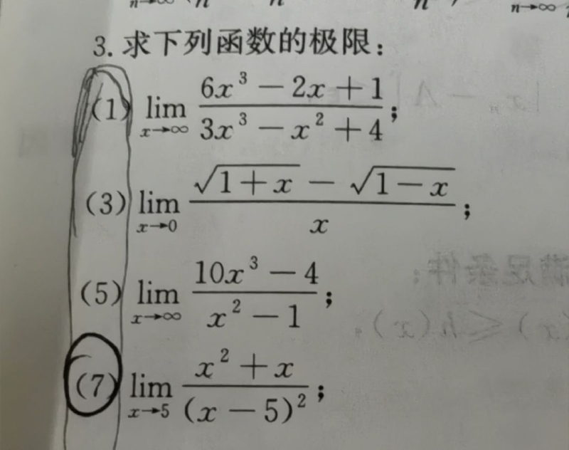 第一题:当x趋于无穷大时,分母和分子都是无穷大,是无穷大比无穷大型,分母和分子最高次项相同时,极限是最高次项系数比,所以答案是2