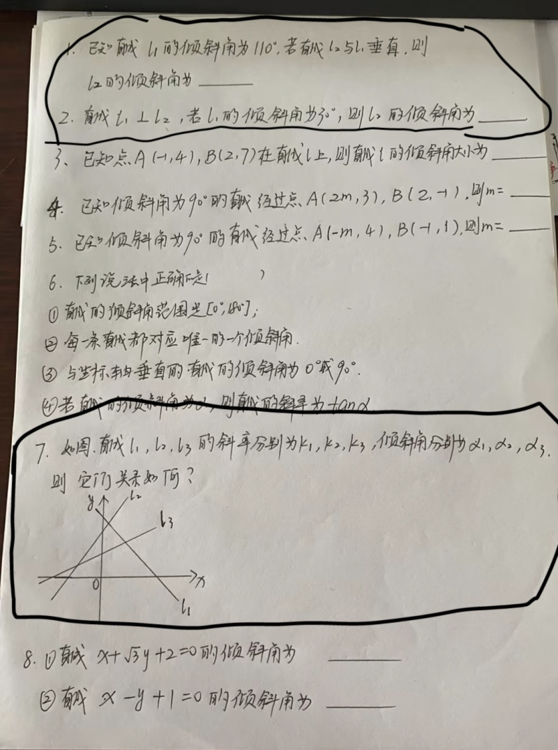 第一题,两条直线互相垂直,则夹角是90°,而直线L1的倾斜角是110°,则直线L2的倾斜角是110°-90°=20°。