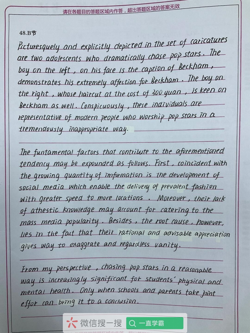还是有语法错误吧,第一段on his face is the caption of Beckham这是一整句话,不能这样做插入语的,可以改成with the caption of Beckham on his face, caption也不是很恰当,tattoo之类的比较合适吧。extremely affection,副词修饰名词不对吧。然后whose这个从句如果非这样写的话,在haircut和at之间要加is,但直接写成whose haircut costs 300 yuan就好了。然后第一段最后一句,tremendously这种词用的有点大,conspicuously放在句首也不好