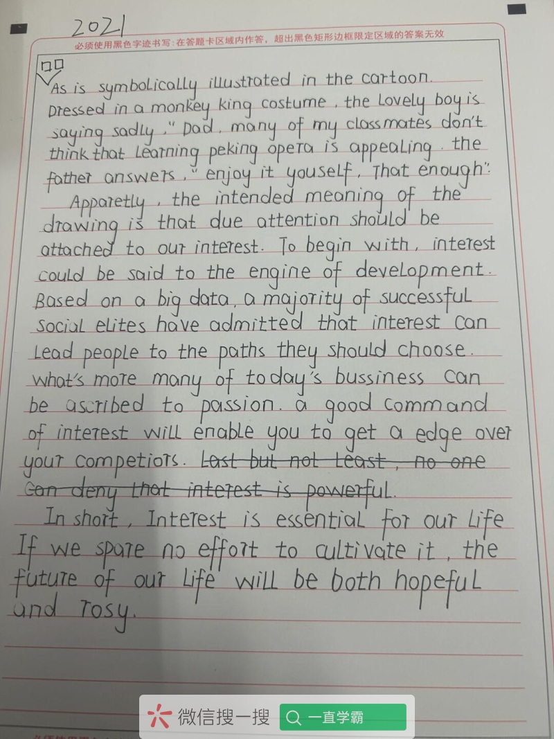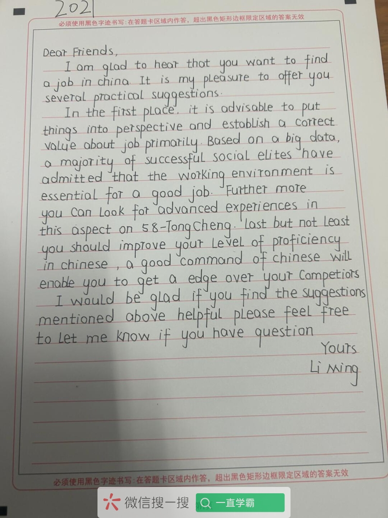 2024-11-05 考研上岸搭子 9 评论 0 喜欢 分享 婭 💗🤖 这个人很懒,还没有简介 查看TA的全部内容 +关注 一直学霸 去发现更多有趣内容 微信扫码打开一直学霸小程序 体验更多「一直学霸」新功能 评论 9 moe233 2024-11-05 0 7分-13分 作者 婭 2024-11-05 0 👏👏要怎么改啊? moe233 2024-11-05 0 回复 婭: 书写工整至少二十分 作者 婭 2024-11-05 0 这还不工整啊? moe233 2024-11-05 0 回复 婭: 啊没有没有 阅卷的印象分很重要 但是书写工整基本可以拿20 词汇啊内容再丰富地道表达下没啥问题 精英 2024-11-05 0 你怎么好多标点符号都没打🥺 作者 婭 2024-11-05 0 草率了😂 浣诀 2024-11-05 0 接批改,199一考前 作者 婭 2024-11-05 0 打分谢谢 我也来讲两句