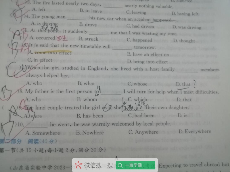 第七题定语从句,先行词指人且从句主语为名词所以用whose
