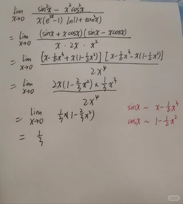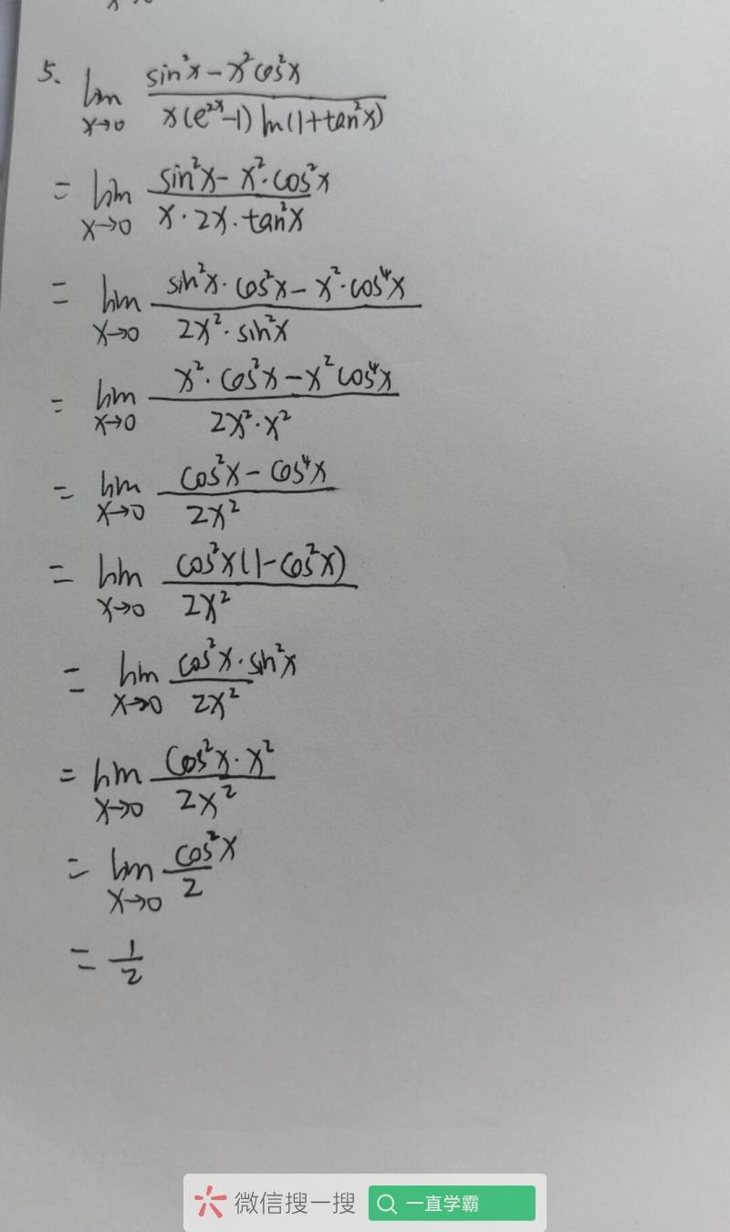 第三个等好分子那个地方sinx的平方不能直接等价成x方。等价无穷小精度不够(直接等价把后面的x^4项舍去了,但是分母有,会导致你算错)。这地方你可以试着把sinx泰勒展开到x^3项,然后两个相乘,你会发现出来了x^4项,但是等价无穷小只有x^2项。错就错在这里。等价无穷小分母你可以随便等价,没问题的,分子不行,会把o(x^2)的高阶无穷小舍去,这会导致误差。除非你的分母只有x^1。那你等价无穷小就可以随便换来