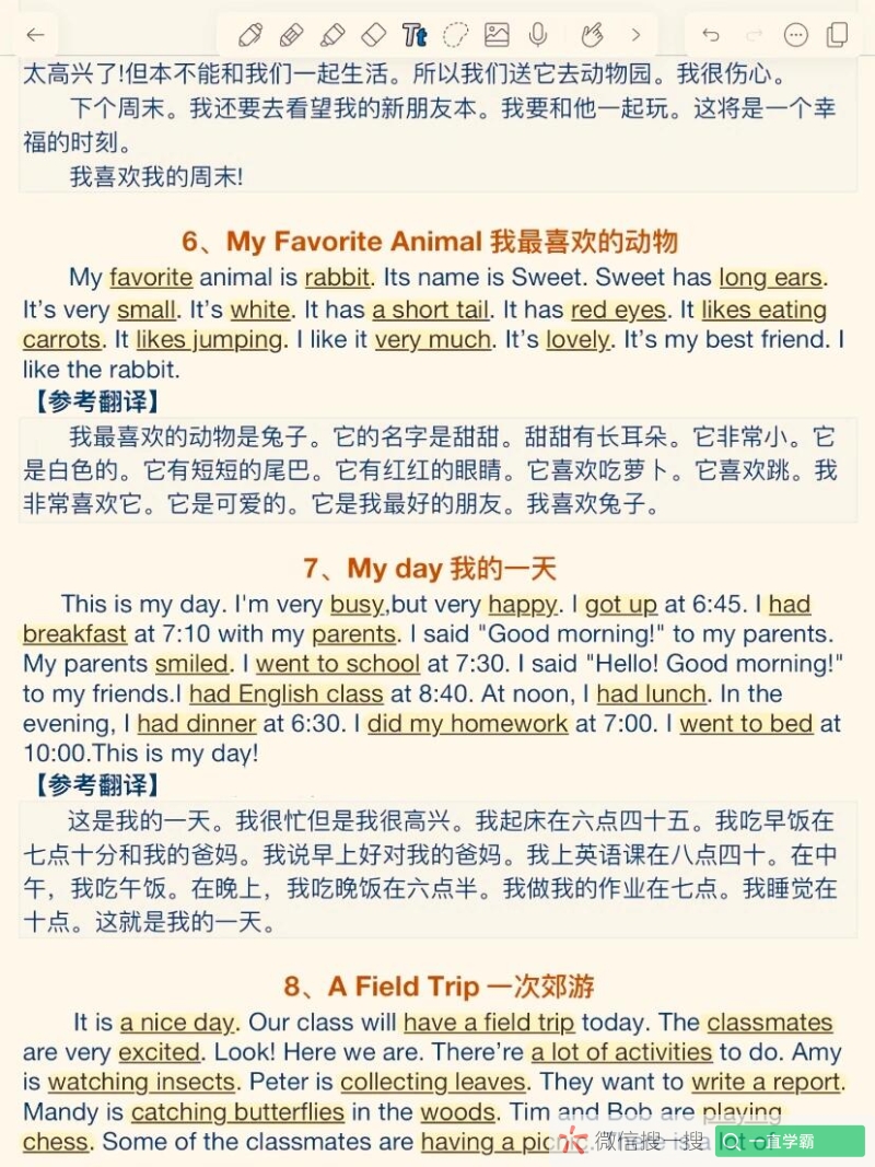 20篇!小学1-6年级英语满分作文!🔥 1-6年级小学英语满分作文!共20篇!赶快为孩子存下吧!超好用!作文稳了!#英语 #英语学习 #英语作文 #英语写作 一、My English Teacher 我的英语老师 二、This is me 自我介绍 三、My family 我的家人 四、My school 我的学校 五、Colourful weekend 丰富多彩的周末 六、My Favorite Animal 我最喜欢的动物 七、My day 我的一天 八、A Field Trip 一次郊游 九、My Winter Holiday 我的寒假 十、In the park 在公园里 十一、My weekend 我的周末 十二、My Village 我的村庄 十三、My Birthday Party 我的生日会 ......