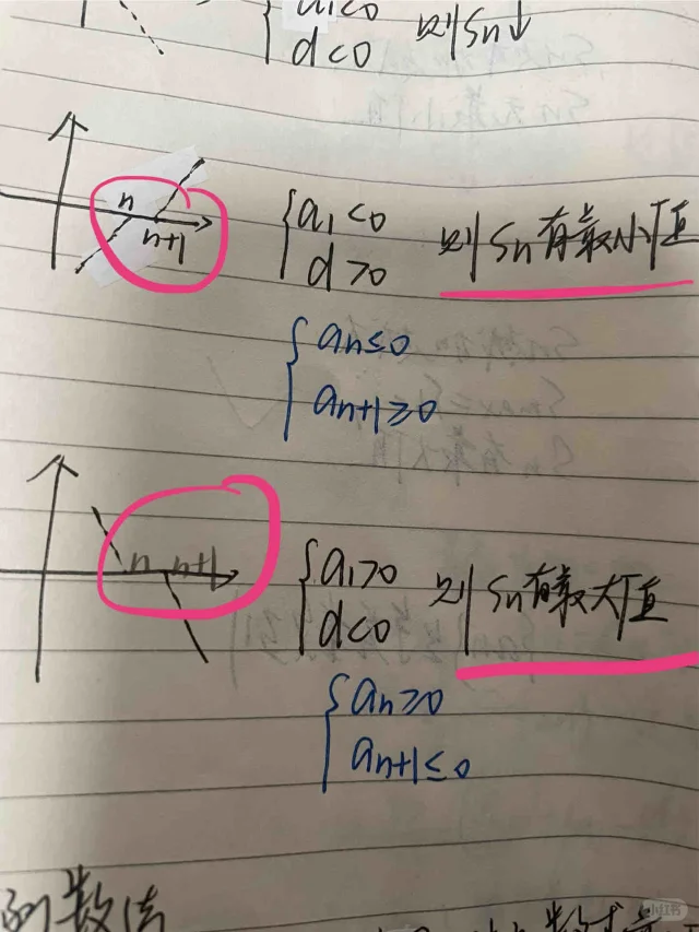 有最小值是因为 an 一开始是小于零的,sn 是几个负数相加,自然越来越小。但 d 是大于零所以等加了几个 d 之后某个 an ≥0,sn 在负 an 相加完之后剩下再加的就只有非负数,sn 开始变大,所以 sn 先减后增,有最小值