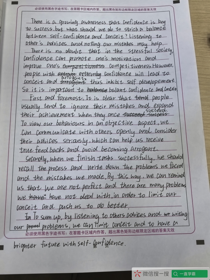 六级写作 ,题目如下 Directions: For this part, you are allowed 30 minutes to write an essay that begins with the sentence "There is a growing awareness that confidence is key to success, but what should we do to strike a balance between self-confidence and conceit?" You can make comments, cite examples or use your personal experiences to develop your essay. You should write at least 150 words but no more than 200 words.