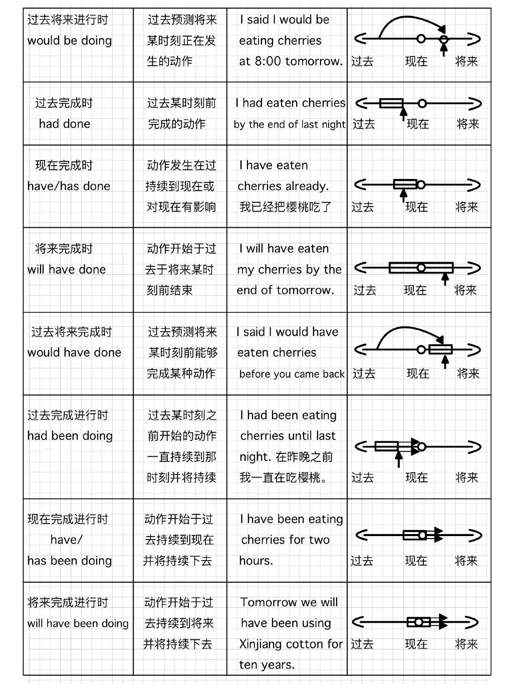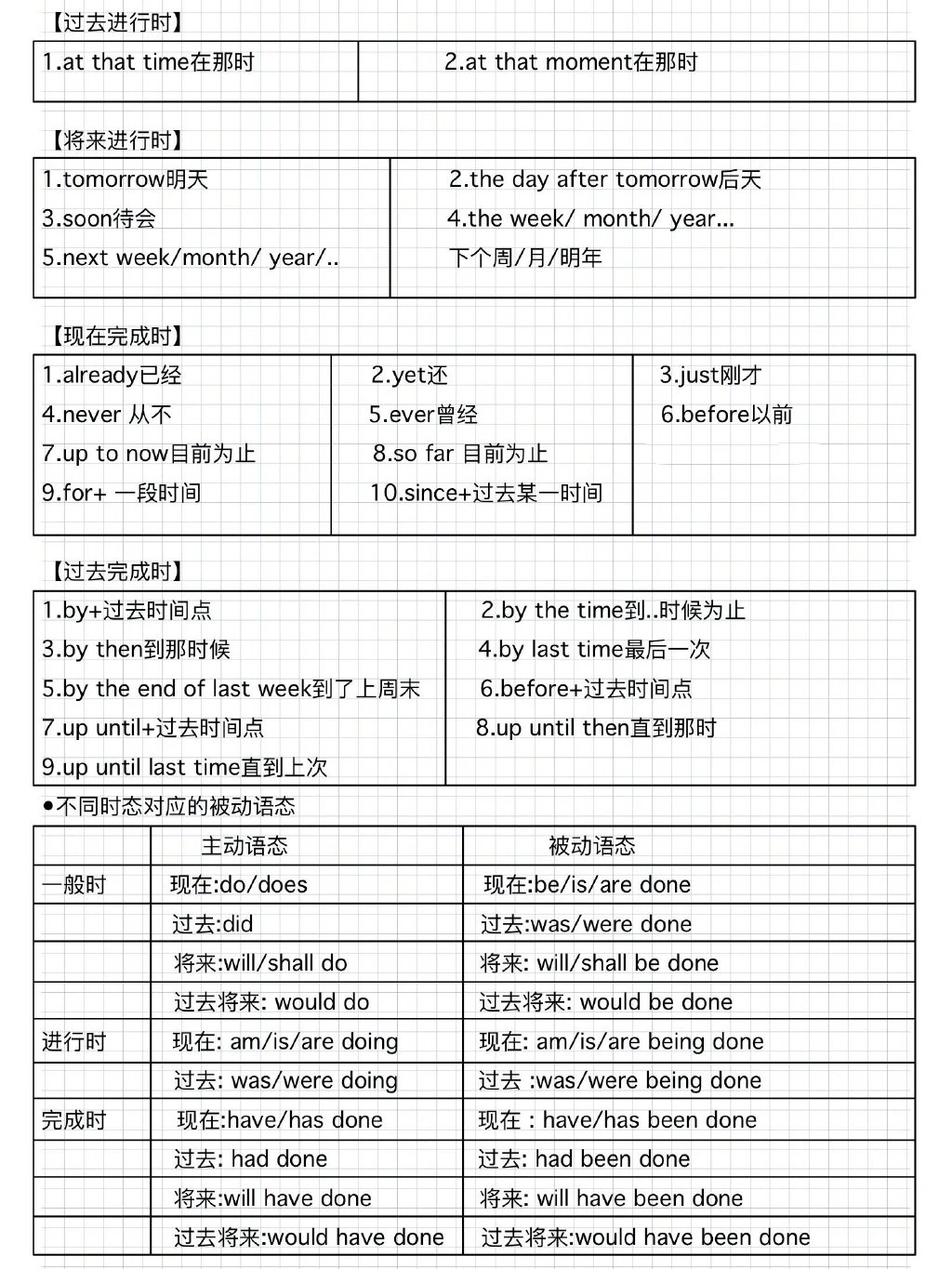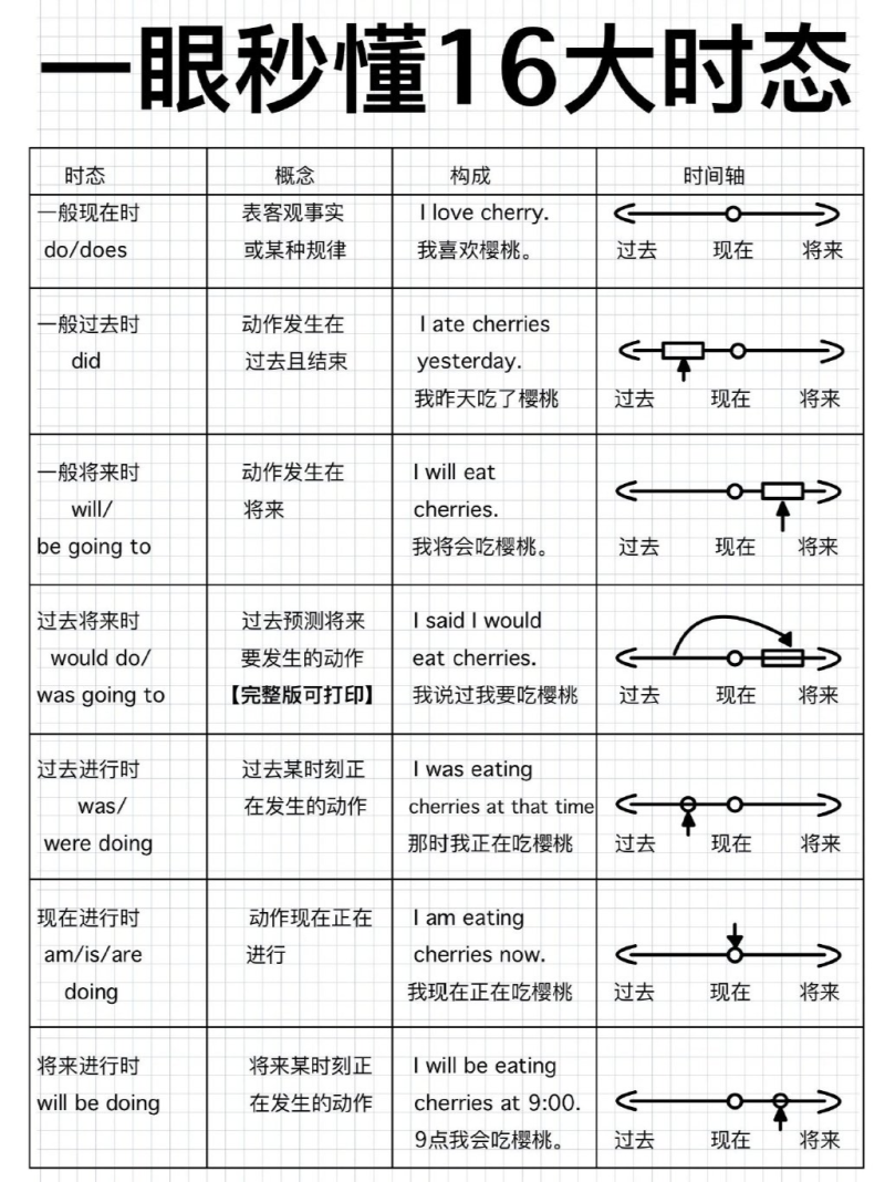 一眼秒懂英语十六大时态,直观图示 1. 一般现在时 (do/does; is/am/are) ①表示现在的情况、状态和特征。 例:He is a student. 他是一个学生。 ② 表示经常性、习惯性动作。 例:He always helps others. 他总是帮助别人。 ③ 客观事实和普遍真理。 例:The earth moves the sun. 地球绕着太阳转。 ④ 表示一个按规定、计划或安排要发生的动作。(常用于列车、客车、飞机或轮船时刻表) 例:The next train leaves at 3 o'clock this afternoon. 下一趟火车今天下午3点开车。 ⑤ 主将从现:在时间、条件和让步状语从句中经常用一般现在表示将的来事情。 例:If it rains tomorrow, we will stay at home. 如果明天下雨,我们会待在家里。