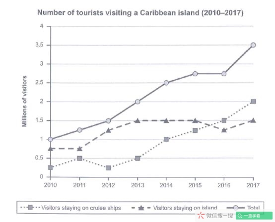 The graph below shows the number of tourists visiting a particular Caribbean island between 2010 and 2017. Summarise the information by selecting and reporting the main features, and make comparisons where relevant. Write at least 150 words.