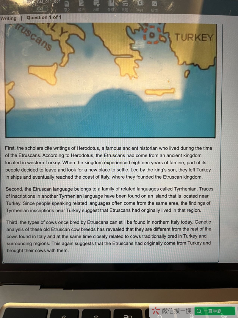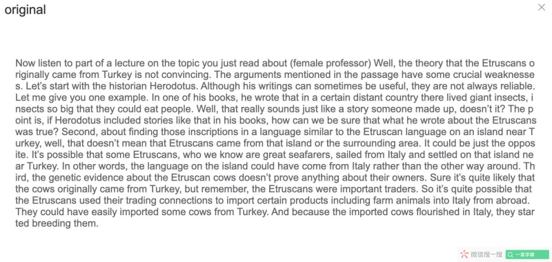 Both the reading and the listening passage delve into the origin of Etruscans. Significantly, the listening material contradicts the reading by presenting three counterarguments. First, the reading paragraph asserts that Herodotus, a historian living in the same period of time with Etruscans, explained the ancient kingdom, which encountered severe drought had moved to a new region and call the new kingdom Etruscan. However, the listening harshly challenges this statement by mentioning its reliability. Since one of Herodotus’ book elaborates a kind of insect that can eat human beings. His descriptions are more of a fictional stories than genuine facts. As a result, his credibility is questionable. Moreover, Etruscans’ language is affiliated to a group, called Tyrrhenian. Related language use on inscription types have been found near the area of Turkey. Thus, evidence allows people to extrapolate that Etruscans lived in the same paces. According to listening, this perspective might be on the opposite for the reason that there were sea fare among them, paving the road transferring the inscription from Italy to Turkey. Finally, cows have been found both from Etruscan and Italy today. Highly-related genes prove that Etruscans originally came from Turkey. The listening refutes this, explaining that the evidence is not concrete enough. There is possibility that cows were imported from Turkey to Italy. After all, Etruscans are famous traders.控制全文總字數在200以內的情況下進行批改,請老師們勿無限放大字數(考場上做不到),平衡字數與內容必要性,別拉低參考價值了