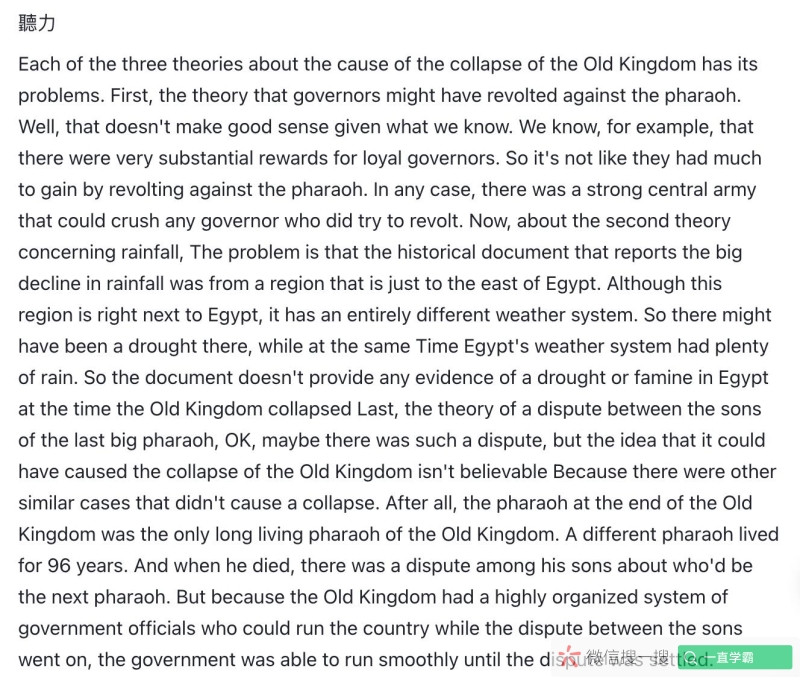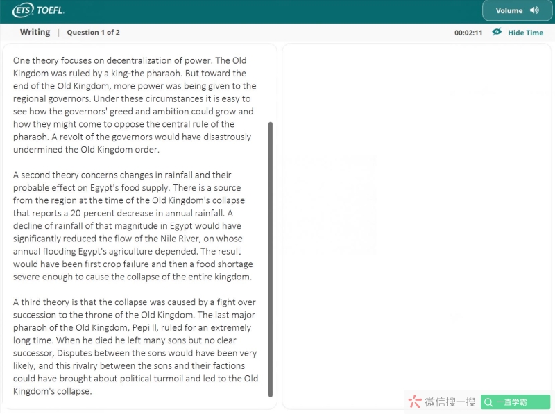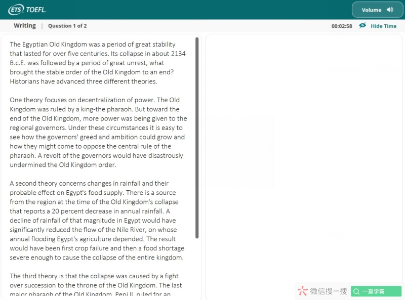 Both the reading and the listening passage delve into what caused the collapse of Egyptian Old Kingdom. Significantly, the listening contradicts the reading material by presenting three counterarguments.
