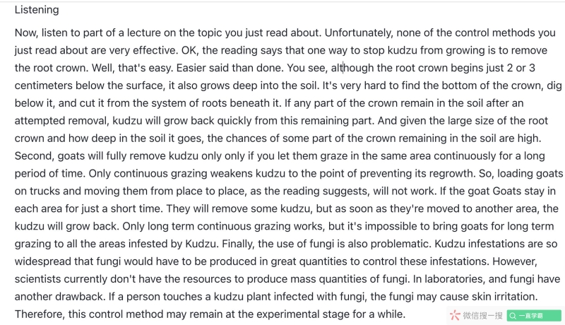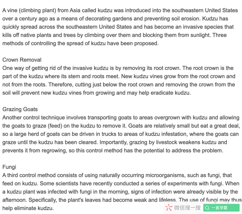 Both the reading and the listening passage delve into the eradication of kudzu. Specifically, the listening material contradicts the reading by presenting three counterarguments. First, the reading asserts a possible measure to eliminate kudzu is to remove its root crown, where the new kudzu grow its new root. By implementing this way, the plants will be significantly removed. However, the listening challenges this statements, highlighting that the roots grow in the deep soil around two to three centermeters. Thus, hardly could people find them and eradicate them. Additionally, they grow at a high speed, making them hard to control effectively. Moreover, the reading content suggests that grazing goats feed on kudzu, and herds of goats play a workable role in eating all of kudzu. Besides, animals clear the roots of the plants, making them hard to grow back. Nevertheless, from the perspective of the listening, under no circumstances could kudzu be fully removed without consecutive and long-time grazing. Practically speaking, grazing in all places are no different from a dream, which means regrowth of the plants are inevitable. Finally, microorganisms are to be expected. Fungi feed on kudze, Experiences from the lab demonstrate the leaves of the plants drastically become less energetic after infection , making the whole kudzu to be faint. The listening refutes this, explaining that there should be a huge amount of fungi that provide a chance of killing all of them. But, scientists lack enough resources to develop that huge quantity of fungi. Consequently, this way is not worth efforts. Furthermore, flaws are to be found that humans' skin are contagious to these fungi, and this is why this control method stop at the experimental stage.