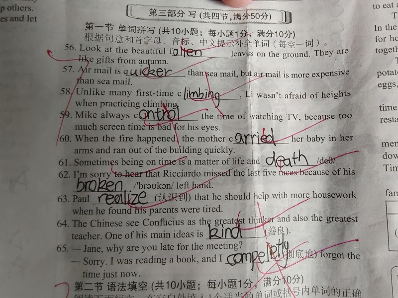 58. 在这个句子中,我们需要填入一个适当的职业名词来描述Li的身份,这个职业与攀爬有关。根据首字母提示“c”,我们可以推断出这个单词与攀爬运动中的角色有关。 填入后的句子:Unlike many first-time climbers, Li wasn't afraid of heights when practicing climbing. 这里的 "climbers" 是名词 "climber" 的复数形式,意味着Li与其他初次尝试攀爬的人不同,他并不害怕高处。