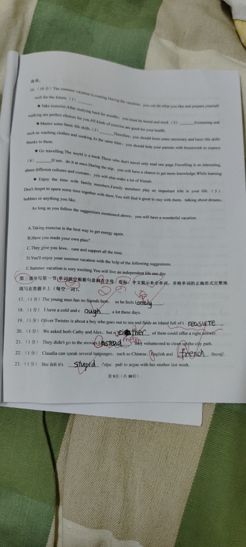 填入后的句子:Oliver Twister is about a boy who goes out to sea and finds an island full of treasures. 这里的 "treasures" 是名词,意指宝藏,用来描述岛上充满了宝藏。