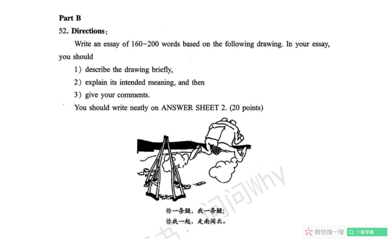 The picture vividly illustrates a scene that carries profound implications where two lame men throw away their crutches, supporting each other as they run forward together. Below the image is a prominent sentence that roughly reads: "Sharing one pair of legs, we can travel far and wide." Evidently, the picture is intended to highlight the significance of cooperation. Firstly, cooperation greatly enhances interpersonal effectiveness. It facilitates smoother communication, reduces conflicts, and enables individuals to achieve goals that cannot be accomplished alone. Furthermore, actively participating in cooperation can significantly enhance personal reputation. It enables individuals to establish a trustworthy image, gain respect from peers and superiors, thus opening doors to opportunities and advancement. Lastly, from a societal level, cooperation is the cornerstone of a harmonious and cohesive society. It reduces social friction, bridges divides between different groups, and creates an environment where everyone can coexist peacefully. Therefore, from the dual dimensions of individual and society, the quality of cooperation is of paramount importance. The whole society should attach great importance to the cultivation of this quality, thereby working hand in hand to create a brighter future. 8