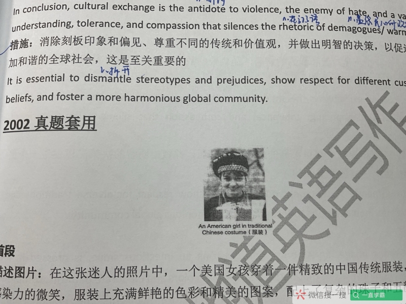 02英一大作文In the captivating image, an American girl, wearing an infectious smile, is dressed in an exquisite traditional Chinese attire that bursts with vibrant colors and elaborate patterns, complete with intricate beads and a colorful headpiece The picture highlights the grandeur and sophistication of traditional culture, as well as the growing trend of cultural exchange. Propelled by the relentless march of globalization and technology, cross-cultural communication has become a buzzword as diverse cultural elements transcend geographic borders and merge. For one thing, world cultures are endowed with a wide variety of traditions and values, offering deep insights into our ancestors' creativity, resilience and wisdom, and paving the way for modern development. For another, in the turbulent world, cultural communication is a silver lining.As the world is threatened with a cascade of conflicts and hostilities amid geopolitical tensions and economic turmoil, cultural exchange can serve as a powerful remedy to these global challenges, shaping a more inclusive, empathetic and peaceful international community. In conclusion, cultural exchange is the antidote to indifference and violence, the enemy of hate, and a vaccine of understanding, tolerance, and compassion that silences the rhetoric of demagogues. Therefore, it is essential to dismantle stereotypes and prejudices, show respect for diverse traditions and values, and make informed decisions to foster a more harmonious global community.