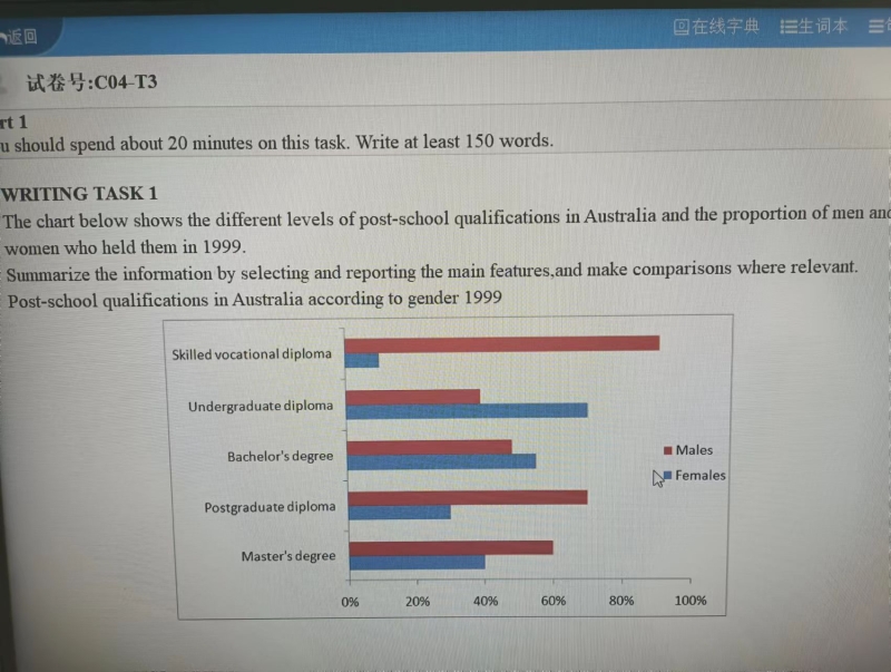 The table below shows Australia’s post-school qualifications and the different percent of gender of them.It is clear that more males have a higher qualification than female. However,females take up more percent of undergraduate diploma and bachelor’s degree .As we can see, the people who have a skilled vocational diploma are men, which is, around 90 percent. But,only 40 percent of the ones who have an undergraduate diploma are male, 60 percent of them are female. Males and females both almost take up half of the people who have a bachelor’s degree. About 60 percent of the people who gained a postgraduate diploma are male, and the other 40 percent are female. The date is quite similar on the percentage of the different genders who have a master’s degree.About 60 percent male and 40 percent female. Of all the comparisons, only two have a higher percentage of females rather than males.