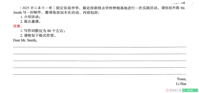 Dear Mr. Smith, I'm Li Hua, a student of your class. I'm writing to inform you about an exciting practical event. Our class is going to the school planting base to enrich experience this Friday afternoon. Details are as follows. The activity will last 2 hours from 2:00 p.m to 4:00 p.m. All the students will be divided into three groups taught by different farmers. Following the tour, we will submit an active record about what we learn about gardening techniques. Finally, we will be trilled if you could share your insights on sustainable living and encourage our creativity. Please let us know if you can attend. Your presence would add a unique perspective to our learning journey. Yours, Li Hua