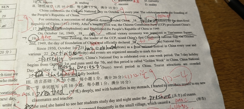 自1950年以来,每年的10月1日都作为中国的一个伟大的全国性节日来庆视,每年都会组织各种各样的)活动来纪念这一天。分析可知,所填动间作句子的调语动间,动词“celebrate”与主语“October 1st”之间为被动关系,同时结合时间状语“Since 1950”可知,这里应是现在完成时被动结构,且主语为第三人称单教,因此为 "has beendone”。故填has been celebrated。