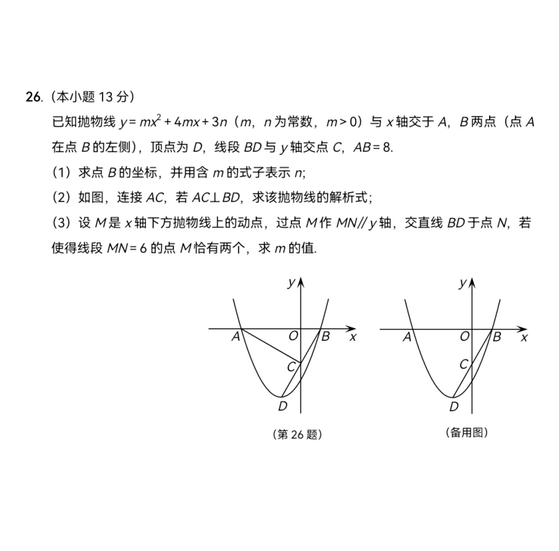 我们可以求出点 D 的坐标为 (-2,-16m)。因为 AC⊥BD,所以三角形 AOC 和三角形 BOD 相似。点 A 的坐标为 (-6,0),点 C 的坐标为 (0,-6m)。根据勾股定理,可得 OC 的长度为 √((0 - 0)² + (-6m - 0)²) = 6m,OB 的长度为 2,OD 的长度为 √((-2 - 0)² + (-16m - 0)²) = √(4 + 256m²)。因为三角形 AOC 和三角形 BOD 相似,所以 OC/OB = OA/OD,即 6m/2 = 6/√(4 + 256m²),通过解方程可求出 m 的值,进而得到抛物线的解析式。